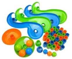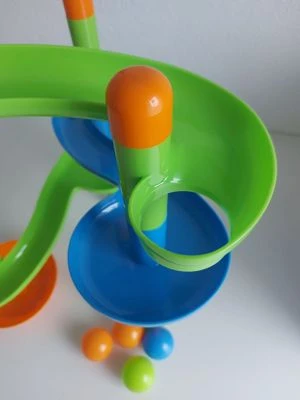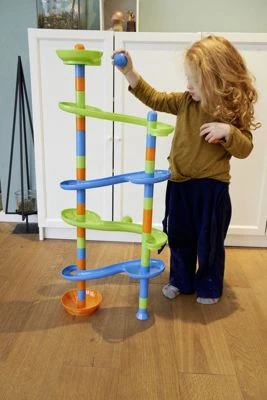 Jumbo-Kugelbahn für den großen Spielspaß! Die Kugelbahn (Höhe aufgebaut: ca.1 m) von alldoro® sorgt für Bau- und Spielspaß bei den Kleinen. Das Set umfasst insgesamt 42 steckbare Elemente bestehend aus Startbecher, 4 Kurven- bzw. Bahnteilen, Verbindungsstücken, Zielbecher, 3 Kappen, 2 Standfüßen sowie 4 großen Kunststoff-Bällen. Die robusten Einzelteile sind aus hochwertigem, glänzendem ABS-Kunststoff hergestellt und ist in einer praktischen Tragetasche verpackt, welche zusätzlichen Stauraum bietet und die bequeme Mitnahme ermöglicht. Zusätzlich zum Spielspaß fördert die Kugelbahn die sensorischen und motorischen Fähigkeiten Ihres Kindes auf spielerische Art und Weise. Der Aufbau erfolgt durch unkompliziertes Zusammenstecken der Einzelteile.