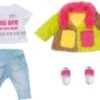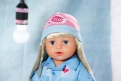 Das BABY born® Deluxe Jeans Kleid Set von Zapf Creation enthält ein komplettes Outfit, das richtig lässig aussieht! Das Jeanskleid ist mit coolen Prints dekoriert und passt super zu der geringelten Leggings. Die Mütze ist ebenfalls mit einem Print verziert und macht gemeinsam mit den angesagten Sneakers das Outfit komplett.