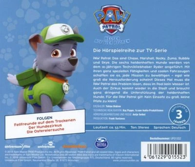 PAW Patrol: Das sind Chase, Marshall, Rocky, Zuma, Rubble und Skye. Diesechs heldenhaften Hunde werden von dem 10-jährigen TechnikliebhaberRyder angeführt. Mit ihren ganz speziellen Fähigkeiten und coolen Fahrzeugenschaffen sie es, jede Mission zu bewältigen egal, wie groß dieHerausforderung scheint! Dieses Mal muss die PAW Patrol das Problemlösen, dass im Pool kein Wasser ist. Auch der Zirkus kommt wieder in dieStadt und braucht ganz dringend die Unterstützung der heldenhaftenHunde. Für die PAW Patrol gilt: kein Einsatz zu groß, keine Pfote zu klein!