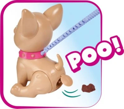 Der SIMBA „Chi Chi Love Poo Poo Puppy“ Hund begeistert durch sein niedliches Aussehen und seine lebensechten Funktionen. Mit der Knete und dem Förmchen lassen sich tolle Leckerlis für den kleinen Hund herstellen. Drückt man beim Spazierengehen die Leine herunter, so setzt er sich hin und macht dein großes Geschäft. Dieses lässt sich dann mit den Tüten aus der süßen Herzbox aufsammeln. So lernt Ihr Kind spielerisch die Verantwortung eines Hundehalters kennen.
