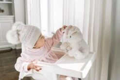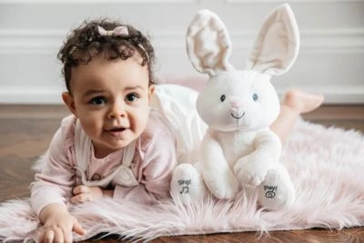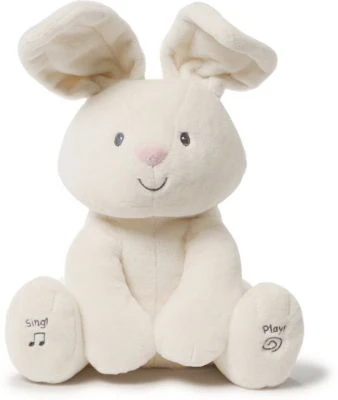Der kuschelig weiche Elefant „Flappy“ sieht nicht nur niedlich aus, sondern beeindruckt Baby auch mit zwei interaktiven Spielmodi! Wenn der linke Fuß gedrückt wird, klappt Flappy seine Ohren vor die Augen und spielt mit Ihrem Kind das beliebte „Guck-Guck“-Spiel. Beim Drücken des rechten Fußes wird der Song „Do your ears hang low“ abgespielt. Dank des robusten Materials können Flecken auch problemlos weggewischt werden.