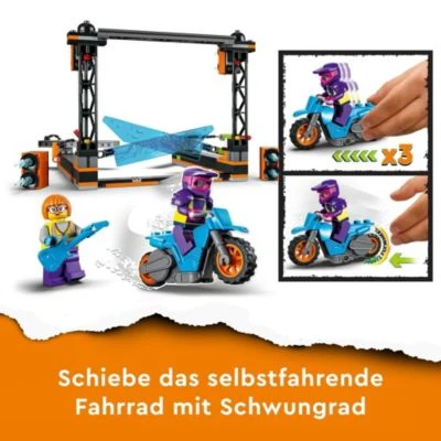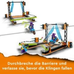 Coole Stunt-Action und spektakuläre Sprünge in der Arena! Mit dem Spiele- und Bauset LEGO® City Hindernis-Stuntchallenge (60340) können tolle Stunt-Wettbewerbe aus der TV-Serie „LEGO City“ nachgespielt und eigene kreative Actionmomente erfunden werden. Mit Shirley Keeper aus der TV-Serie „LEGO® City – Abenteuer“ und dem grandiosen und furchtlosen Stuntbike-Fahrer Wellensprinter geht es auf die Hindernis-Stuntchallenge. Wellensprinter steht auf seinem Bike bereit. Mit Schwung geht es durch das beeindruckende Hindernis mit den fallenden Klingen. Geschafft! Erleichtertes Raunen geht durch das Publikum. In dem Set enthalten sind die 2 Minifiguren Shirley Keeper und der Stunt-Fahrer Wellensprinter, eine baubare Kulisse als Hindernis, ein Stunt-Bike mit Rückzugsmotor und weitere Zubehörteile für kreative Action-Momente. Eine bebilderte Anleitung führt sicher durch das Bauprojekt.