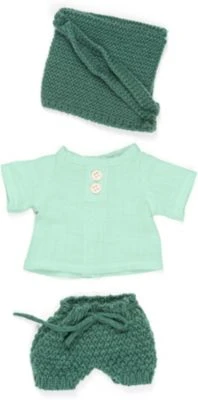 Das Miniland Kleiderset FOREST besteht aus einem dezenten Baumwoll-T-Shirt, einem gestrickten Wollhöschen und einem Strickschal aus Wolle. So wird die Puppe schön warm gehalten und hat es immer sehr gemütlich! Das Set eignet sich für alle 32 cm großen Miniland-Puppen.