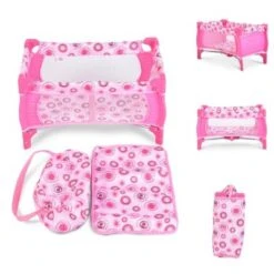 Puppenbett in pink und lila faltbar mit farblich abgestimmter Matratze mit Tragetasche fĂĽr die Aufbewahrung oder den Transport mit Seitenfenster
