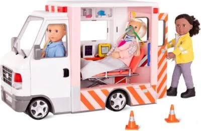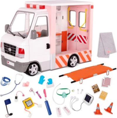 Dieser Krankenwagen fĂŒr Puppen von Our Generation ist fĂŒr jede Situation gewappnet. Eine umfangreiche Ausstattung an Utensilien sorgt dafĂŒr, dass verletzten Puppen im Notfall schnell geholfen werden kann. Das elektronische Fahrzeug verfĂŒgt ĂŒber moderne Tools, wie leuchtende Scheinwerfer, eine Hupe und bewegliche Scheibenwischer. So kommt man bei jedem Einsatz schnell ans Ziel und ist schnell als helfende Hand vor Ort.