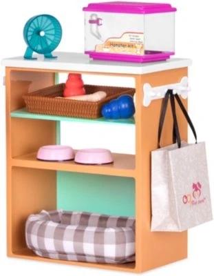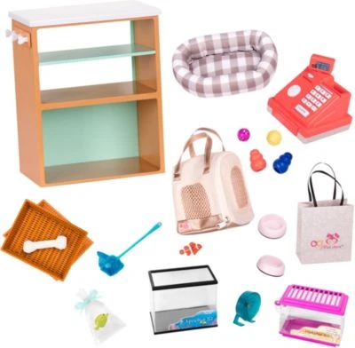 Unterstütze deine Puppen von Our Generation dabei, ihre eigene Tierhandlung zu eröffnen! Hier bekommt man alles, was die treuen Vierbeiner glücklich macht. In dem Regal kannst du die Accessoires schön präsentieren. Was möchte der erste Kunde wohl kaufen – vielleicht ein kuschelweiches Hundekörbchen?