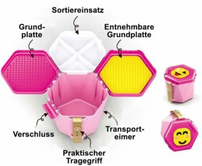 Mit dem neuen _x001E_ Bucket Boy_x001C_ -Spieleimer von Sluban kann jetzt auch unterwegs problemlos gebaut und gespielt werden. Im Eimer sind insgesamt 348 Teile enthalten mit denen die Kinder beliebig bauen und stecken können. Als Hilfe beim Bauen besteht der Spieleimer aus einem dreiteiligen, ausklappbaren Deckel in dem kleine Grundflächenplatten befestigt werden können, damit das Gebaute sicher hält und auch nichts verloren geht. Die Sluban Bausteine sind voll kompatibel zu anderen gängigen Konstruktionsb