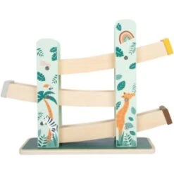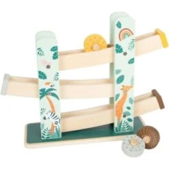 Mit Schwung durch die Wildnis! Auf dieser Kugelbahn aus Holz im angesagten „Safari“-Look rasen drei verschieden farbige und mit Mustern verzierte Holzräder die drei Rampen hinunter. Die Abfahrt ist mit Safari-Tieren und trendigen Blätter-Motiven detailreich verziert. Ausdauernder Spielspaß vorprogrammiert! Ein echter Hingucker und Anziehungspunkt für jedes Kinderzimmer! Besonders standfest durch breiten Standfuß!